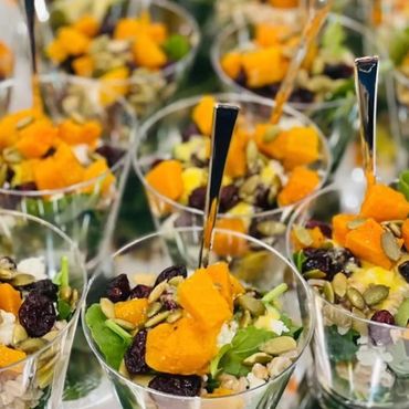 Roasted squash, pumpkin seeds, dried cranberries, farro, goat cheese, homemade orange citrus dressing recipe