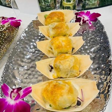 Ricotta, parmesan, and fresh mozzarella cheese, fresh basil rolled in thinly sliced eggplant topped with marinara sauce.